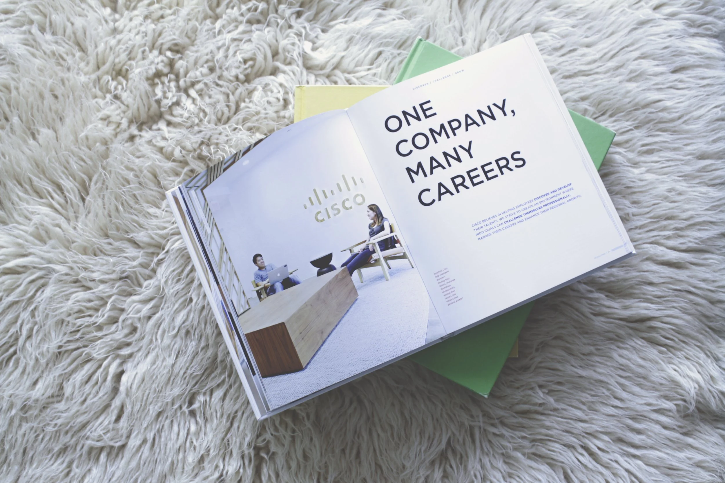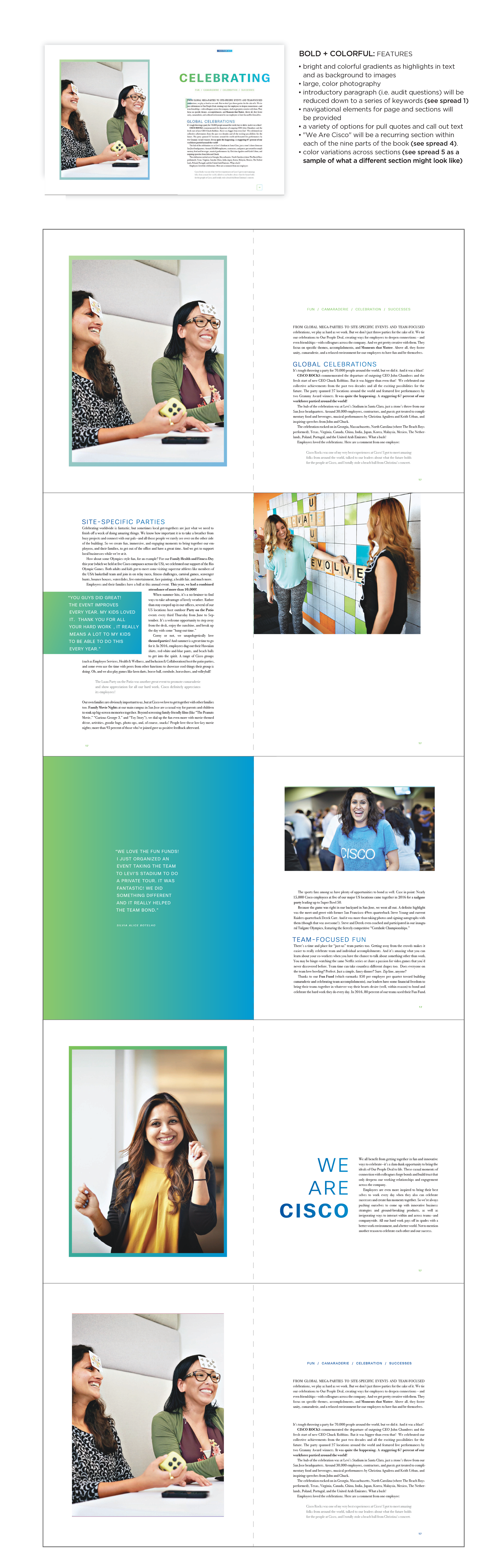 In partnership with Cisco, fellow designer Rachael Paine and I worked to collaborate on The Cisco Culture Book; the company's experience publication. Cisco wanted us to design a clean and modern comprehensive company publication that encapsulated Cisco's core values and company culture.