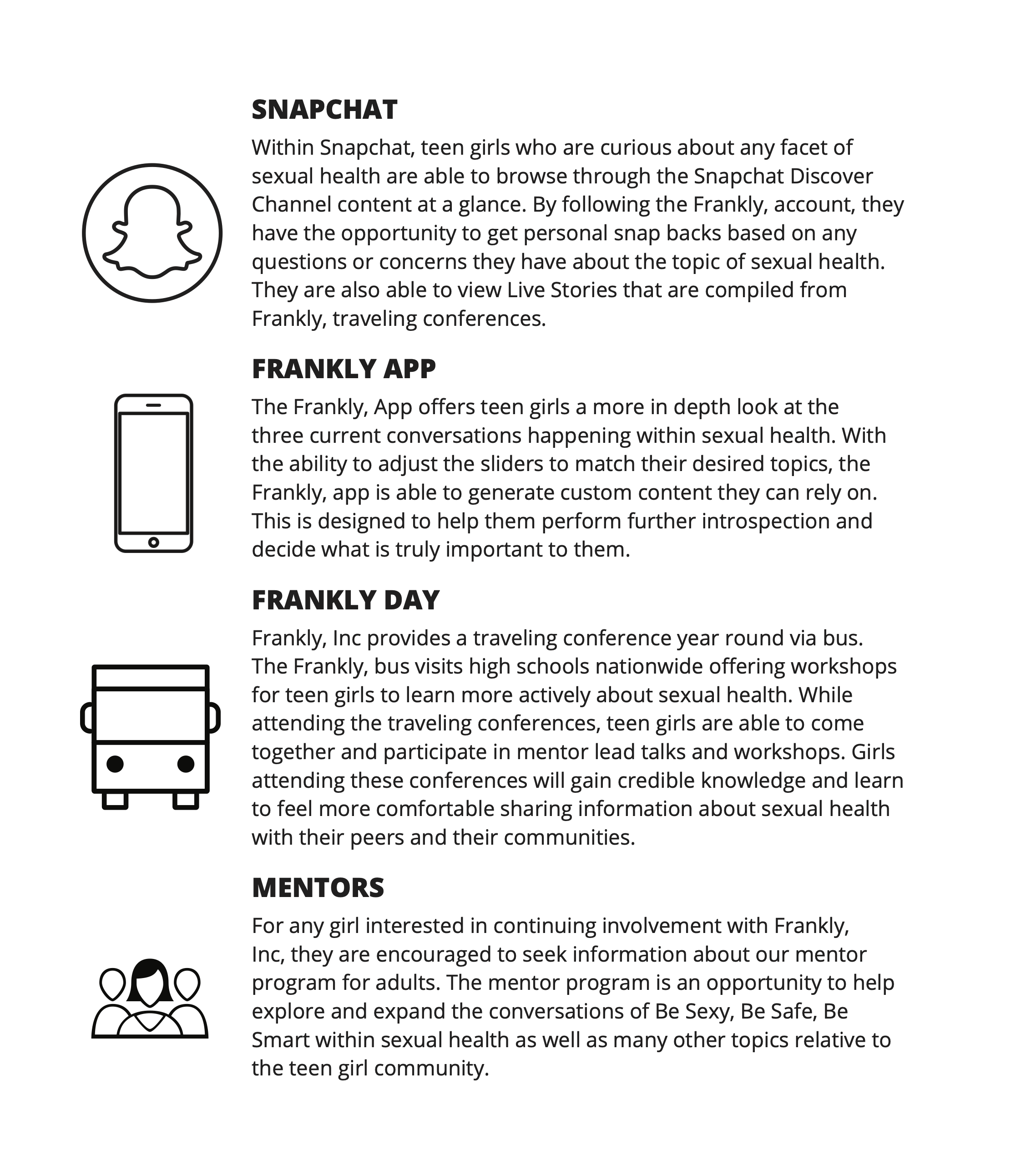 The Frankly, ecosystem works to provide the most relevant sexual health content to teen girls. Through the Frankly Snapchat, App, and Conferences, we, as an organization strive to meet girls where they are. Both online, via the Frankly App and the Snapchat, as well as in real life, with the Frankly Day initiative. In interacting with the Frankly, touchpoint teenage girls will be able to effectively apply the knowledge they’ve gained in order to establish an open minded view of their personal sexual health.