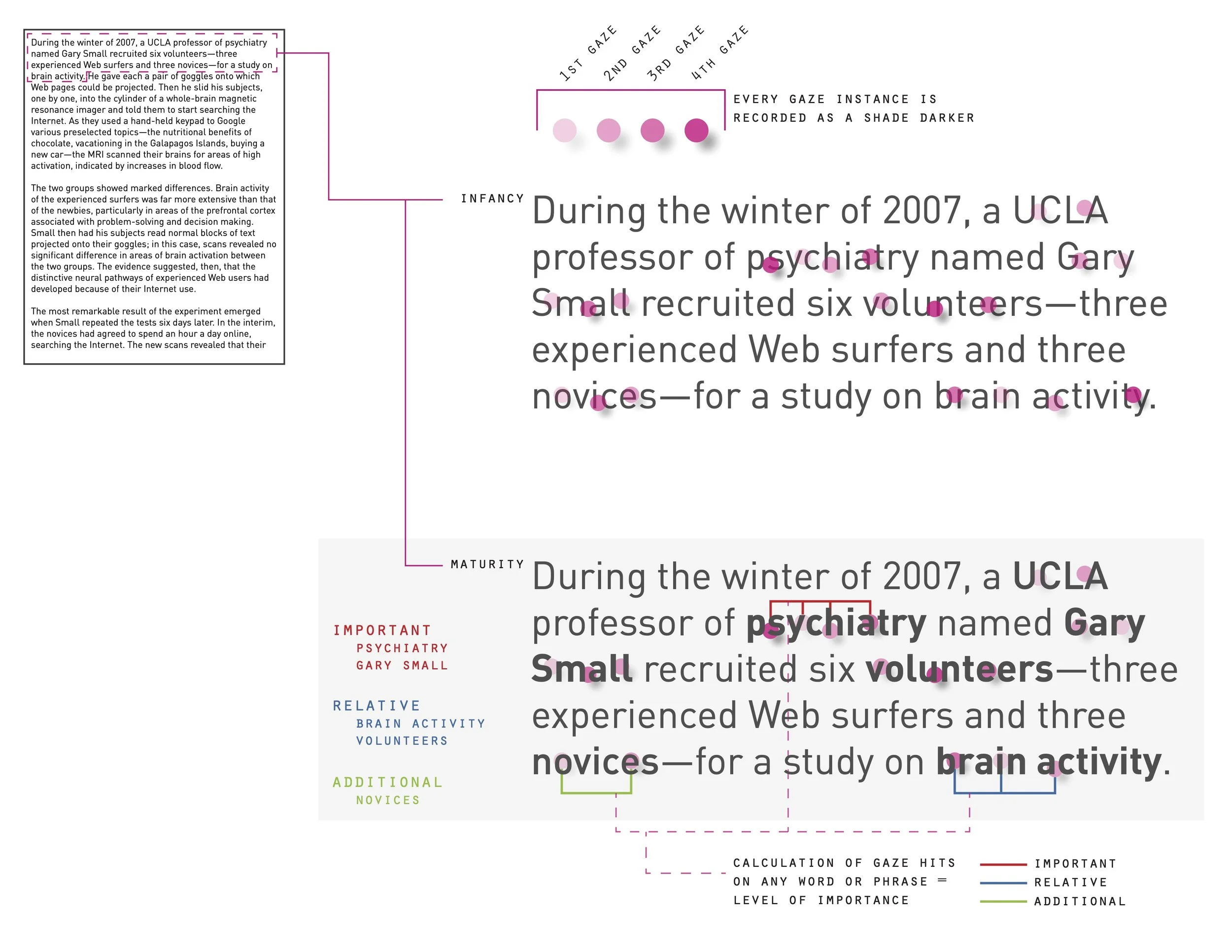 Continuing with the idea of relational levels and how they can provide room for synthesis within an article, I focused on representing gaze tracking. I explored how a gaze-based interface might interpret a viewer's reading pattern regarding skimming and/ or scanning.