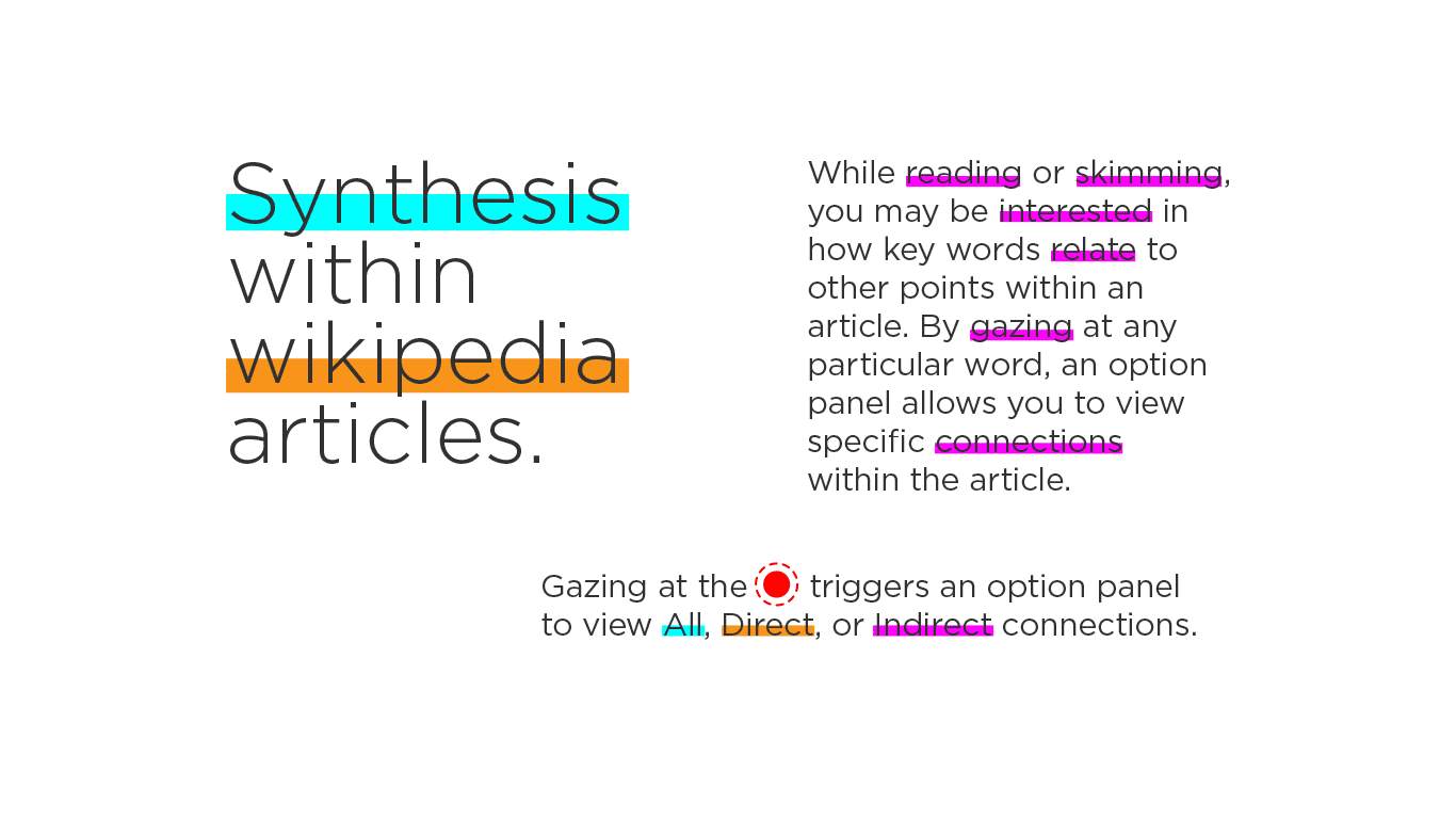 Investigating how a gaze-based interface can interpret reading patterns to alert viewers and present visual evidence of progress during the reading process, I started by analyzing typical approaches to reading academic articles. Most people often skim and scan with a goal of finding information related to a specific topic. They look for keywords, theories, diagrams, and conclusions drawn to decide if the article is useful for worth a more detailed read. While this is important, I started to question if there was more a gaze-based interface could offer to emphasize synthesis within the reading material.